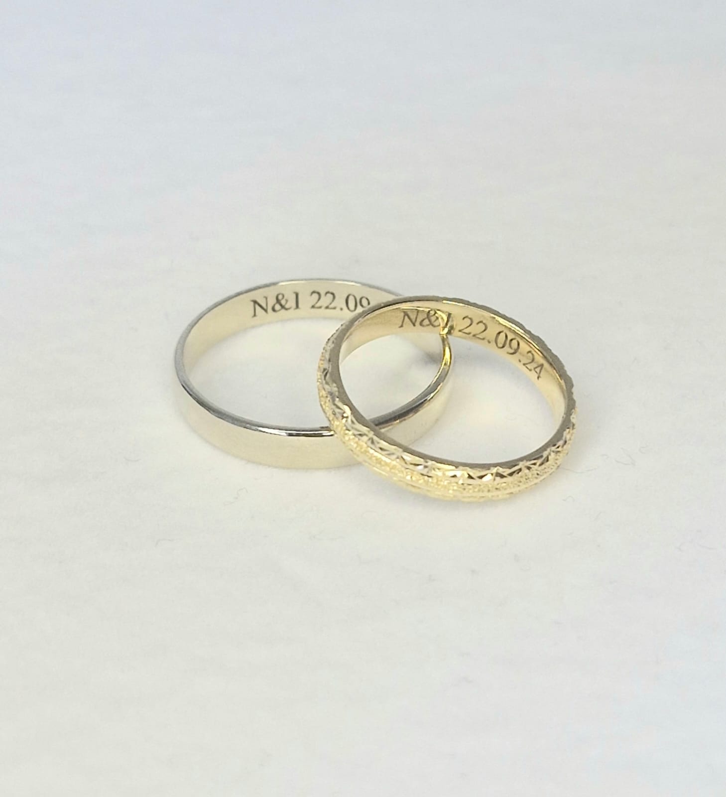מה ניתן לחרוט על טבעת נישואין? לרוב מדובר בשמות בני הזוג, תאריכים חשובים כמו יום החתונה או יום ההיכרות, ולעיתים גם מסר קצר שמסמל את הזוגיות: משפט אישי, מילה בעלת משמעות או אפילו סמל קטן. החריטה הופכת את הטבעת למזכרת נצחית שנושאת עמה את סיפור האהבה הייחודי של בני הזוג.